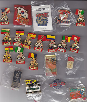 Title (ebay affiliate link): TWENTY ONE DIFFERENT COCA-COLA HAT PINS, OLYMPICS, NFL, SOCCER ETC #1.