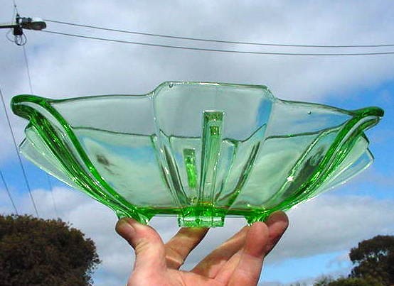 Title (ebay affiliate link): 1930s ART DECO WALTHER GREEN URANIUM DEPRESSION GLASS BOWL or TROUGH VASE-RARE!