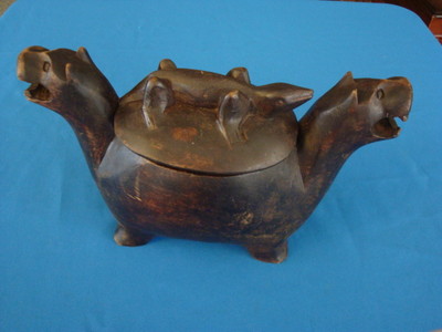 Vintage Hand Carved WOOD BOWL Two-Headed Hippo With Lizard Lid