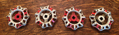 Title (ebay affiliate link): Lot of 4 Vintage red & white water faucet valve handles