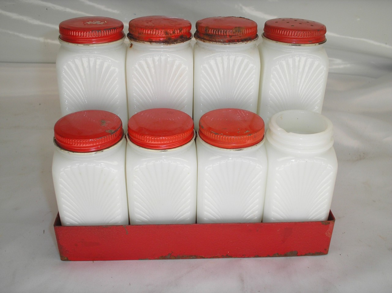 Antique Milk-White Glass Spice Jars w/Red Metal Holder