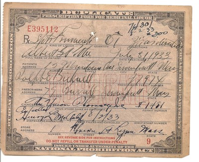 Title (ebay affiliate link): PROHIBITION PRESCRIPTION FORM FOR MEDICINAL LIQUOR 1933 LYNN MASS