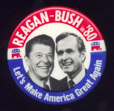 Title (ebay affiliate link): Reagan-Bush in '80 button: "Let's Make America Great Again" pin pinback