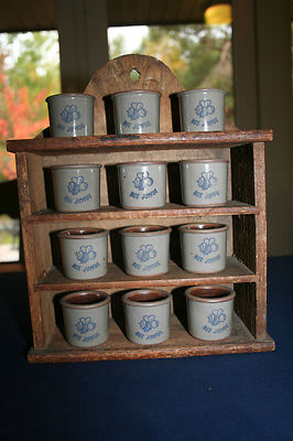 Title (ebay affiliate link): ANTIQUE PRIMITIVE BEE JOYFUL 12 MINIATURE STONEWARE CROCKS BLUE & WHITE/GRAY