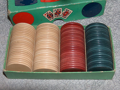 Title (ebay affiliate link): ANTIQUE BOX OF BAKELITE POKER CHIPS - RED WHITE AND BLUE