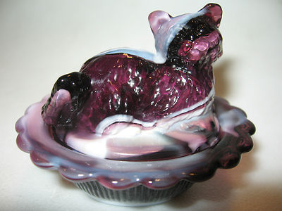 Title (ebay affiliate link): Amethyst purple & milk slag glass salt celt cat kitten kitty on nest basket dish
