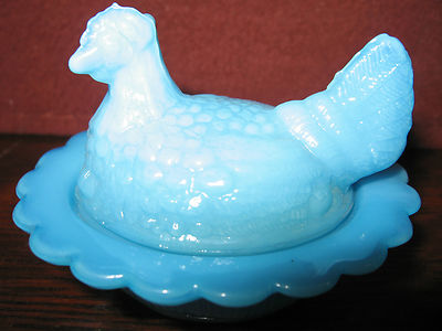 Title (ebay affiliate link): Blue milk glass salt cellar celt hen / chicken on nest basket dish rooster chick