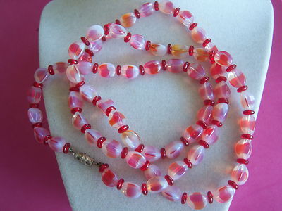 VINTAGE RED AND WHITE MILK GLASS ? LONG NECKLACE 33"