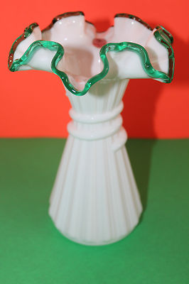 Title (ebay affiliate link): FENTON MILK GLASS OPALESCENT GREEN RUFFLED TOP WHEAT VASE~7-1/2 T X 4" W~ EC