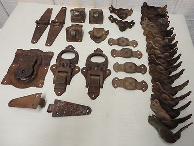 Large Group of Antique Trunk Hardware, 33 Pieces, Latches, Lock, Corners, Etc