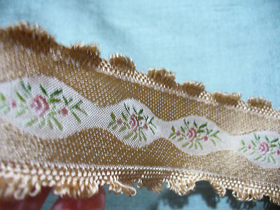 87 " Vintage woven Embroidered Tan flower Ribbon antique doll clothes millinery