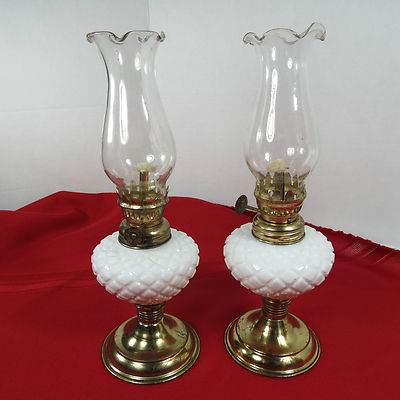 Two Vintage Small Milk Glass Oil Lamps Matching Pair