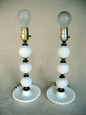 Title (ebay affiliate link): Pair of Vintage Fenton Hobnail Milk Glass & Brass Table Lamps w/Beaded Base!