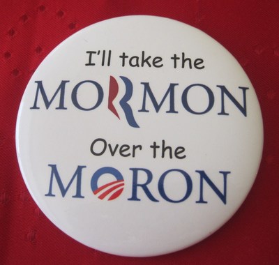 Title (ebay affiliate link): I'LL TAKE THE MORMON OVER THE MORON PRESIDENTIAL buttons 3"