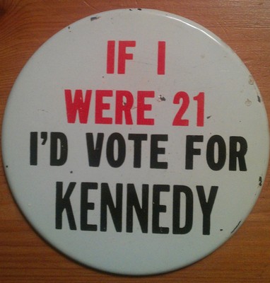 Title (ebay affiliate link): John F Kennedy Campaign Button Badge Pin 1960: If I Were 21 I'd Vote For Kennedy