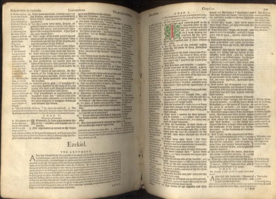 Title (ebay affiliate link): 1580 Geneva Black Letter Bible Leaves/RARE/BI-FOLIO/TITLE EZEKIEL HAND COLORED!