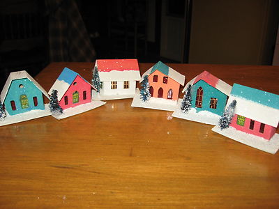 Title (ebay affiliate link): VINTAGE 6 PUTZ HOUSES CHRISTMAS VILLAGE CARDBOARD MICA.BRUSH COLOR WINDOWS DOORS