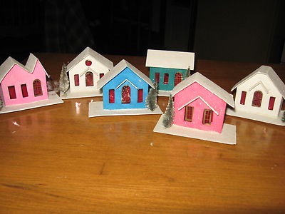 Title (ebay affiliate link): VINTAGE 6 PUTZ HOUSES CHRISTMAS VILLAGE CARDBOARD MICA.BRUSH COLOR WINDOWS DOORS
