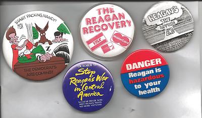 5 Clever and Humorous Anti-Reagan Buttons,Start Packing Nancy, Warmongering Etc.