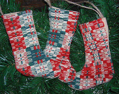 Title (ebay affiliate link): Primitive CHRISTMAS Stocking Ornies Vintage Woven Red & Green Coverlet Stocking