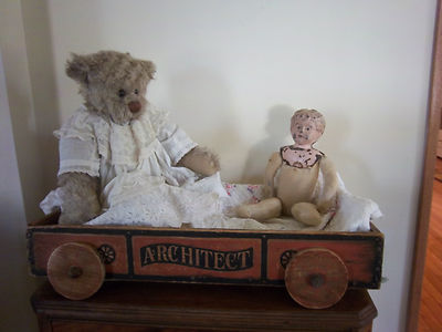 Title (ebay affiliate link): Primitive Antique Wood Box Folk Art Child Toy Wagon Graphics on All Sides