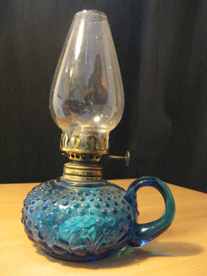 AZURE BLUE MOULDED VICTORIAN FINGER OIL LAMP.
