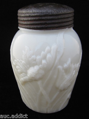Title (ebay affiliate link): Antique ca. 1890's Opal Milk Glass Sugar Shaker with Embossed Iris or Tulips