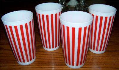 4 VINTAGE HAZEL ATLAS GLASSES RED WHITE STRIPES MILK WHITE OPAQUE