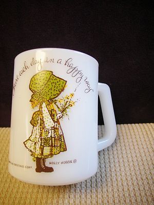 Title (ebay affiliate link): Holly Hobbie Milk Glass Coffee Mug D Handle Federal Glass American Greetings