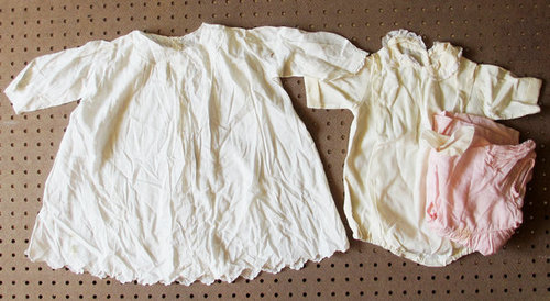 Title (ebay affiliate link): Hand Sewn Antique Cotton Doll Dress + Ivory Teddy + Pink Dress Lot
