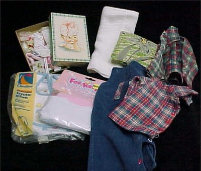 Title (ebay affiliate link): Vintage Antique Baby Doll LOT Kimono Overalls Shirts Bibs Pillow Blanket & More