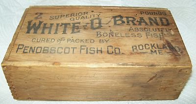 Old Dovetailed Wooden Box Advertising White O Brand Fish fm Penobscot Fish Co ME