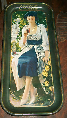 VINTAGE ANTIQUE 1921 ORIGINAL COCA COLA COKE LONG SERVING TRAY LADY BLUE BERET