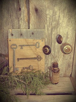 Title (ebay affiliate link): Primitive Decoration Skeleton Key Sampler Old Button Flowers Bottle Needfuls ~DN