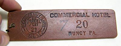 VINTAGE OLD WOODEN COMMERCIAL HOTEL MOTEL KEY CHAIN ADVERTISING FOB MUNCY PA