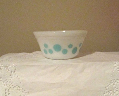 Title (ebay affiliate link): VINTAGE MILK GLASS BOWL WITH TURQUOISE BLUE POLKA DOTS FEDERAL GLASS