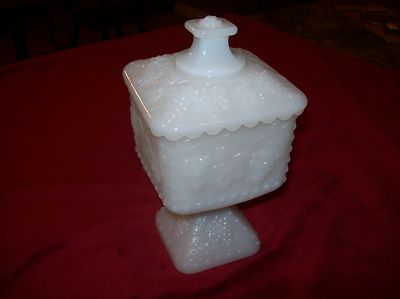 Title (ebay affiliate link): Vintage Milk White Pedestal Square Candy Dish with Lid, Grapes and Leaf Design.