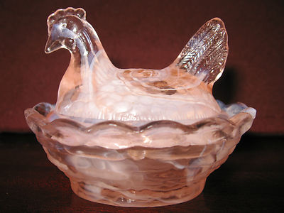 Title (ebay affiliate link): pink and milk slag glass salt celt hen chicken on nest basket dish rooster white