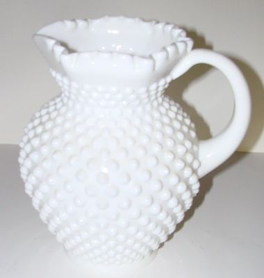 Title (ebay affiliate link): VINTAGE FENTON WHITE MILK GLASS HOBNAIL RUFFLED EDGE PITCHER 8 1/2"