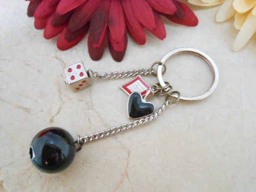 Title (ebay affiliate link): VINTAGE BLACK RED SILVER TONE HEART DICE CASINO GAMBLING KEYCHAIN B6889