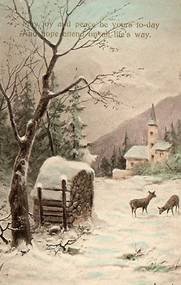 Title (ebay affiliate link): VINTAGE CHRISTMAS GREETINGS postcard of SNOW SCENE WITH DEER