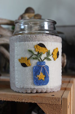 Title (ebay affiliate link): Primitive Sunflowers & Blue Ball Jar Penny Rug Candle Wrap