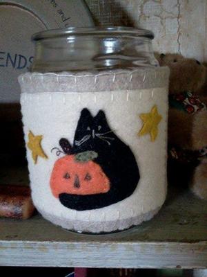 Title (ebay affiliate link): Primitive Halloween Penny Rug Candle Wrap (Black Cat, Pumpkin and Stars)