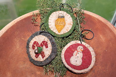 3 Primitive Penny Rug Ornie/Bowl Filler (yellow ornie,,snowman,&candycane)