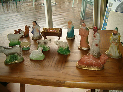 OLD 15 PIECE CHALK CHRISTMAS NATIVITY SCENE