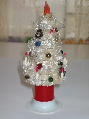 Title (ebay affiliate link): VINTAGE MINIATURE WHITE CHRISTMAS TREE CANDLES BEAD ORNS LIGHTS WORKS C BATTERY