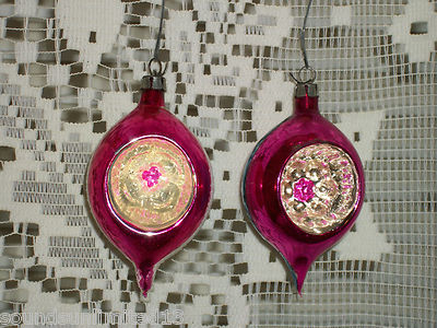 2 REFLECTOR INDENT GLASS ORNAMENTS PINK BLUE STRIPE MICA CHRISTMAS TREE POLAND