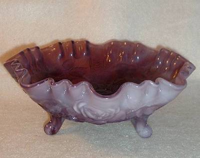 Imperial Glass Amethyst Purple Slag 3 Footed Ruffled Rim Rose Pattern Bowl