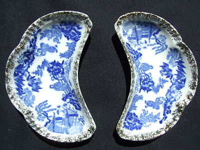 2 vtg ANTIQUE FLOW BLUE FISH BONE OYSTER CHINA DISH ASIAN THEMED 4-1/2" NICE
