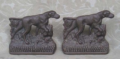 Title (ebay affiliate link): 2 ANTIQUE SOLID CAST IRON BRONZE FIGURAL HUNTING DOG BOOKENDS DOORSTOPPER
